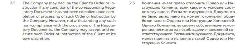 В пункте 2.5. договора указано, что БКС Маркетс вправе отклонить ордер или инструкцию форекс трейдера, если сочтет нужным. А клиенты понесут, в свою очередь, потери.