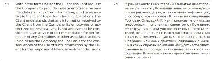В пункте 2.9. упоминается, что форекс трейдеры не имеют права запрашивать никакой дополнительной информации у аферного форекс центра БКС Маркетс. Нарушение явное.