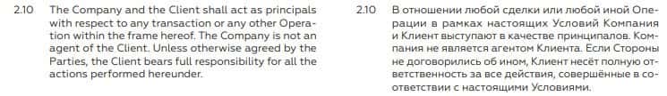 Пункт 2.10. договора посвящен тому, что BCS Markets возложил всю ответственность на клиентов, а с себя, наоборот, снял все гарантии и ответственность в рамках законодательства.