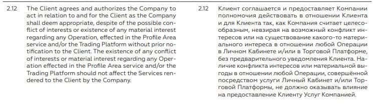 В пункте 2.11. соглашения упоминается, что клиент соглашается на то, что сам брокер или другие аффилированные лица будут иметь финансовую выгоду от проведенных сделок.
