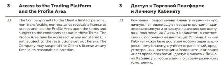 В пункте 3.1. идет речь о том, что лживая компания BCS Markets имеет право прекратить доступ пользователя к личному кабинету в любое время по своему разумному усмотрению.