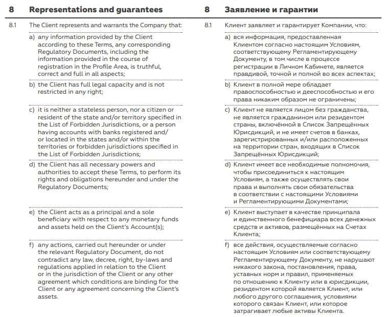 Следующий пункт в договоре махинаторов посвящен тому, что брокер BCS Markets указал огромный список требований, возлагаемых на форекс клиентов, но нет обратного списка к ним.