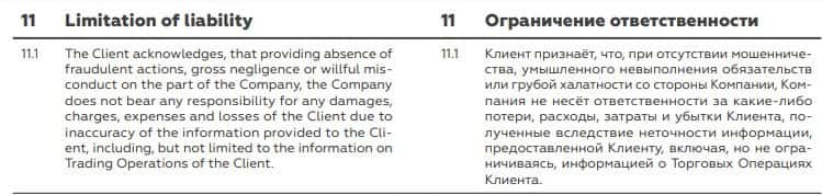 Пункт 11.1. свидетельствует о полном несоблюдении законодательных норм мошенниками BCS Markets, поскольку они вновь ограничили свою ответственность перед пользователями.