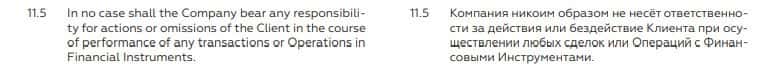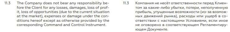 Пункт 11.3. соглашения сообщает, что BCS Markets не несет никакой ответственности за убытки и потери при совершении сделок. Это означает, что ворюги не отвечают перед законом.