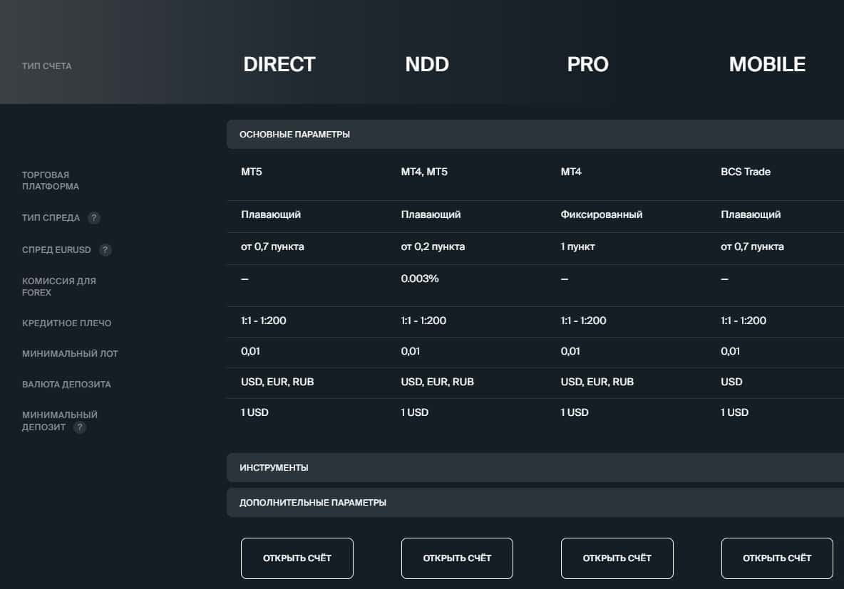 Если валютного трейдера все же разведут на открытие торгового счета у BCS Markets и вложения денег, то предложат один из четырех счетов. Полный список на нижнем скриншоте.