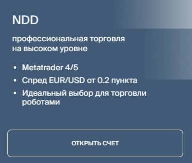 "NDD" - второй торговый счет, предполагающий идеальный выбор для клиентов для торговли роботами и спред EUR/USD от 0.2 пункта. Но под всем таится потеря Вами средств.