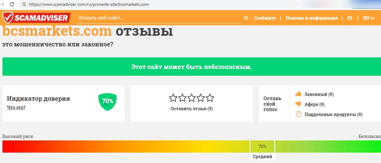 Мошеннический брокер BCS Markets по мнению популярного веб-сайта scamadviser com имеет средний рейтинг 70 %, что может быть не совсем безопасно для форекс трейдеров.