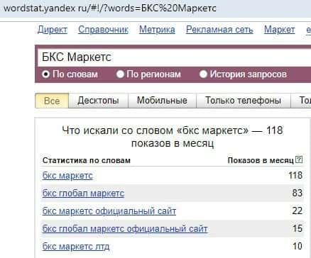 Русскоязычный вариант брендового имени "БКС Маркетс", вбиваемого с одним пробелом в поисковом сервисе Яндекс.Вордстат, набрал 118 значений по запросам за месяц.