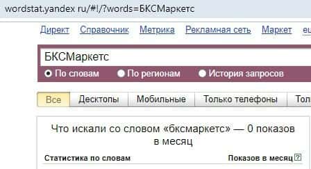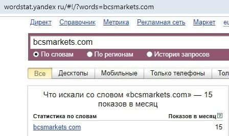 Нуль запросов в месяц в поисковике Yandex осуществляли по фиктивному форекс брокеру BCS Markets на русском языке, а конкретно - делали поиск без пробела "БКСМаркетс".