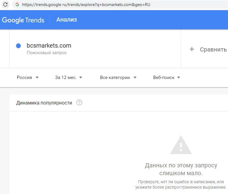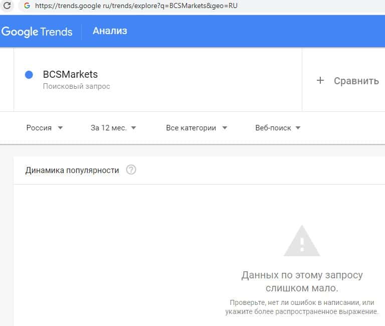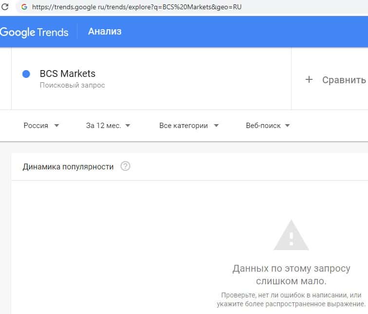 Далее попробуем совершить поиск в системе Гугл Трендс брендового имени на английском языке с одним пробелом "BCS Markets". Ответ такой же, слишком мало запросов.