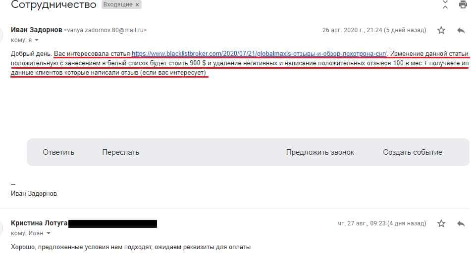 Ниже представлена переписка BlackListBroker с клиентом, в которой жулики требуют 900 долларов за изменение статьи на положительную, и 100 долларов за положительные отзывы.