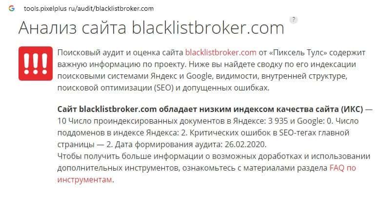Анализ сайта лохотронщиков BlackListBroker показал, что данный веб-портал обладает низким индексом качества, что является признаком скам-проекта.
