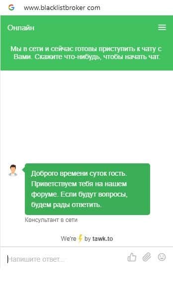 Также шулера BlackListBroker предоставили в качестве обратной связи онлайн-чат, при помощи которого ведут сбор данных о клиенте, фиксируя все данные на сайте.