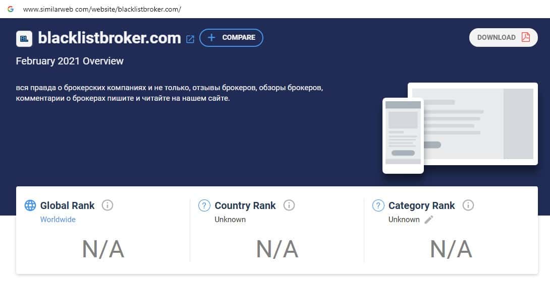 При проверке источников бренда по странам скам-компании BlackListBroker на сайте similarweb com, информация отсутствует, что является признаком фальшивого лохотрона.