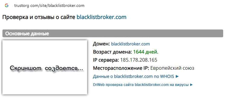 Проверка интернет-портала аферистов Блек Лист Брокер на trustorg com показала, что возраст домена к моменту написания статьи составляет 1644 дня, вероятно домен купленный.