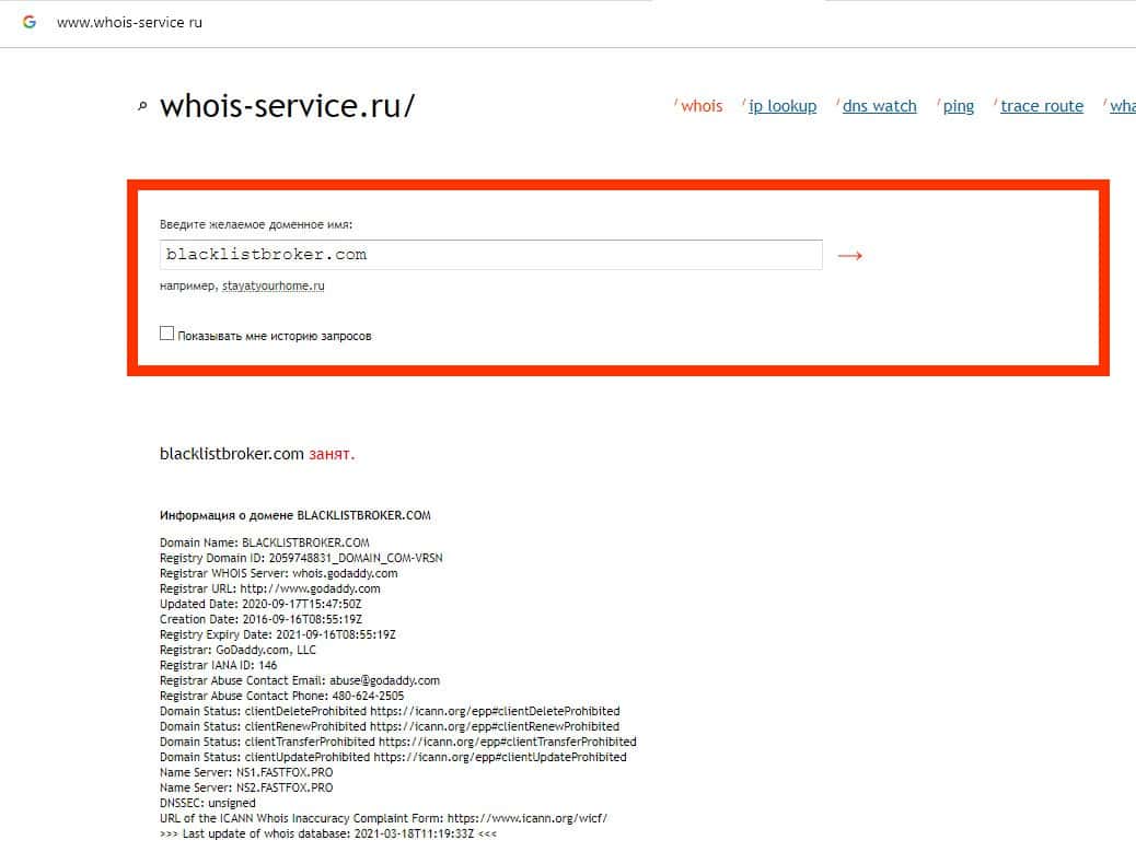 - Отсутствие данных о владельце домена аферистов BlackListBroker