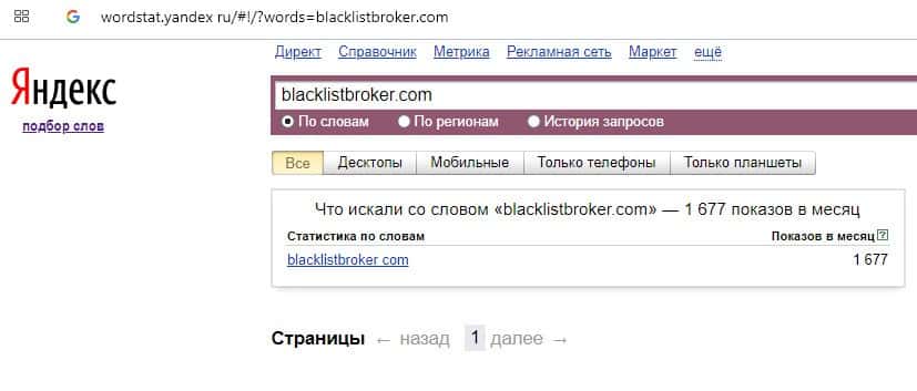 Данный интернет-лохотрон под названием "blacklistbroker.com" вероятнее всего пользуется популярностью на wordstat yandex ru из-за рекламы в интернете.
