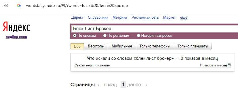 Количество запросов по бренду названия компании на русском языке "Блек Лист Брокер" на Яндекс Вордстарт вероятно равно 0.