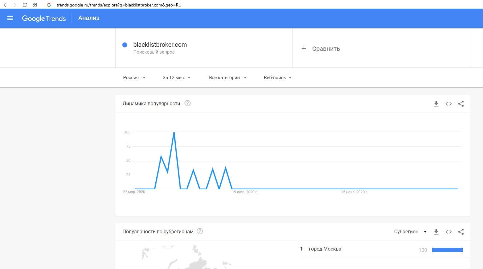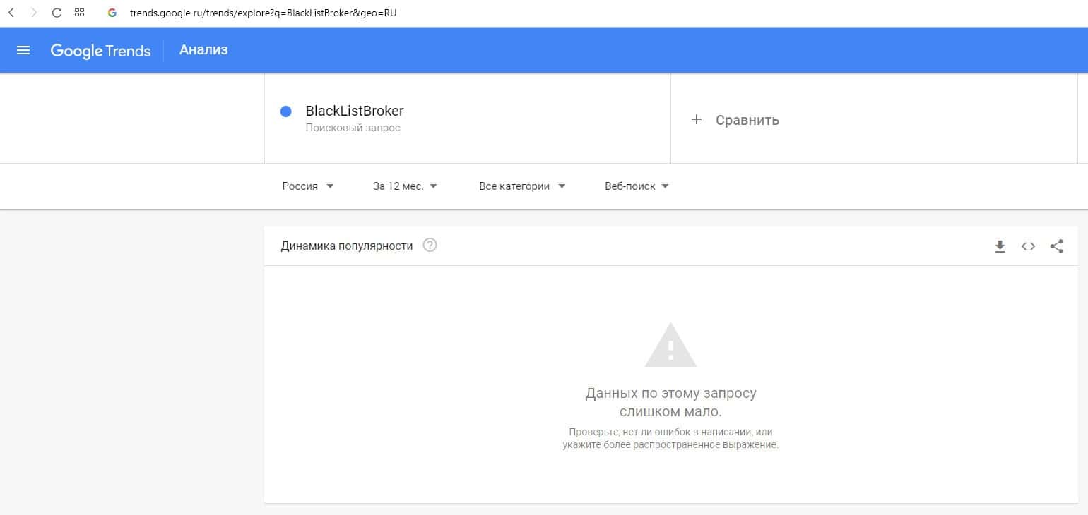 По количеству запросов по бренду названия компании на английском языке "BlackListBroker" на trends google ru данные отсутствуют.