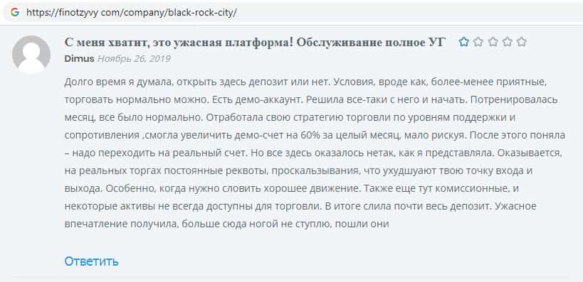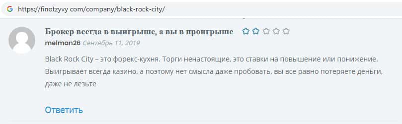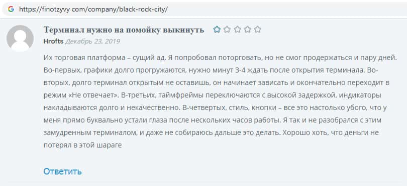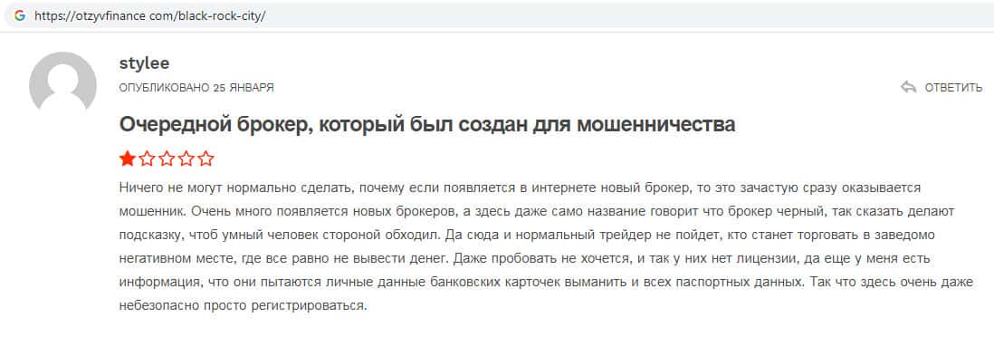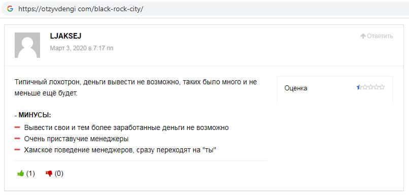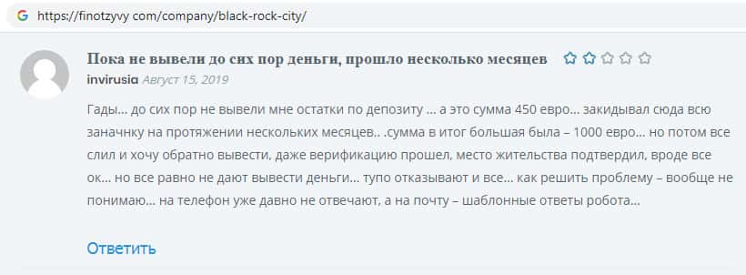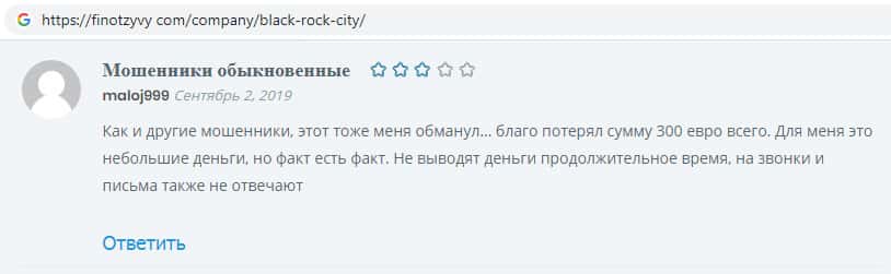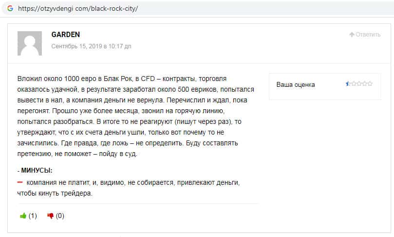 На веб-ресурсе otzyvdengi com обнаружен отзыв о жуликах Блек Рок Брокер, автор которого пишет, что потерял на их фальшивом сайте 1000 евро. Аферисты списали все денежные средства с торгового счета, которые так и не пришли на банковскую карту пользователя. Подобной мошеннической уловкой пользуется большинство подобных интернет-лохотронов.