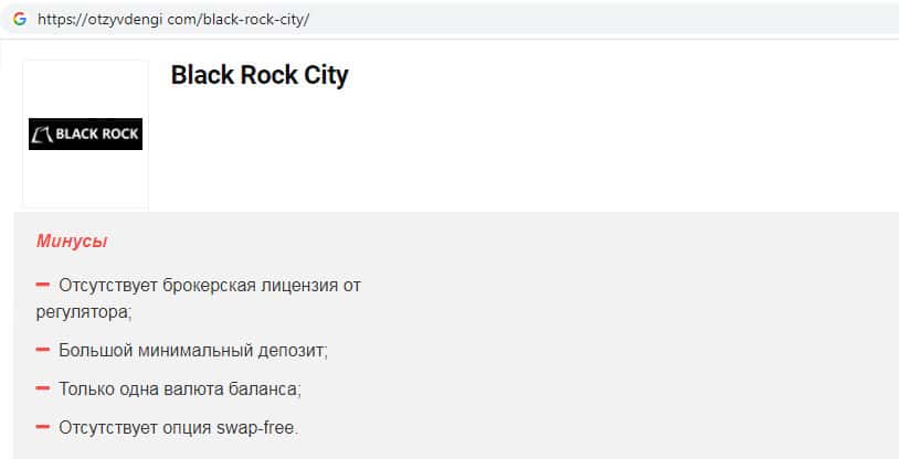 На веб-сайте отзывденьги ком найдена информация о шулерах Блек Рок Брокер, сайт которых по всей видимости разработан на скорую руку, поскольку нет никакой информации о наличии лицензии на брокерскую деятельность. Так же главным недостатком скам-конторы BlackRock-Broker Biz является большой минимальный депозит.
