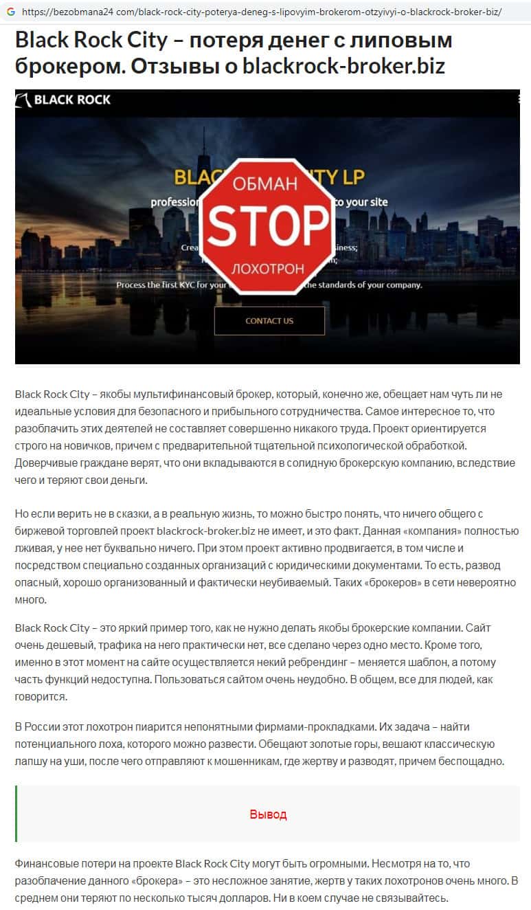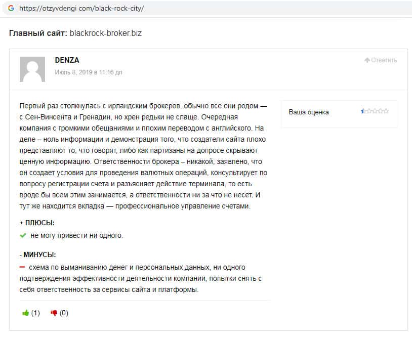 На веб-портале otzyvdengi com отыскан отзыв о мошеннической организации Блек Рок Брокер, автор которого убедился в том, что вывести даже вложенные денежные средства на их сайте невозможно, не говоря уже о той прибыли, которую они обещают. Таких фейковых сайтов как BlackRock-Broker Biz во всемирной паутине очень много.