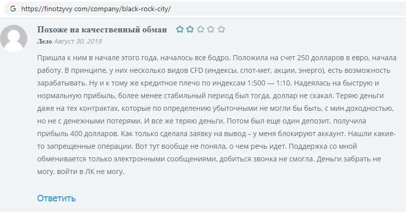 На онлайн-ресурсе finotzyvy com расположен отзыв о псевдо-брокерской конторе BlackRock-Broker Biz. Автор данного комментария пишет, что она надеялась на быструю прибыль и пополнила счет на 250 долларов. Но когда подала заявку на вывод средств поняла, что связалась с аферистами, которые сразу же заблокировали ее аккаунт.