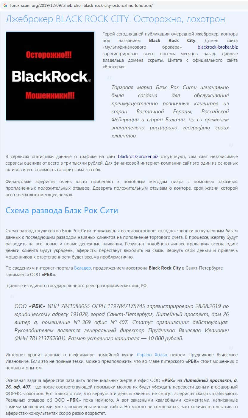 На веб-сервисе otzyvdengi com отыскан комментарий о мошенниках BlackRock-Broker Biz, которые обворовывают людей как только могут. В интернете нет ни одного доказательства того, что на их дырявом сайте можно получить какую-либо прибыль. Из этого следует сделать вывод о том, что безответственный скам-брокер Блек Рок Брокер ни за что ответственности не несет.