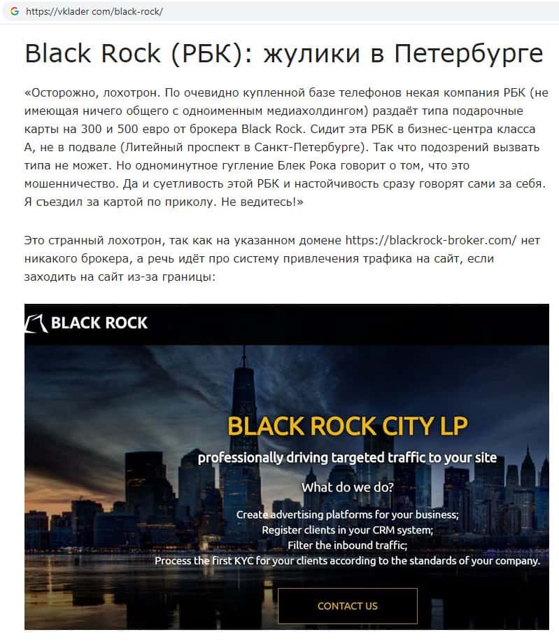 На интернет-ресурсе vklader com замечена статья-отзыв об аферистах BlackRock-Broker Biz, на сайте которых ни в коем случае нельзя регистрироваться, поскольку представители данного интернет-лохотрона достаточно убедительно рассказывают о якобы возможности неплохого заработка. Верить жуликам Блек Рок Брокер нельзя !!!