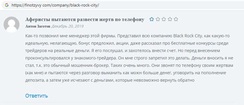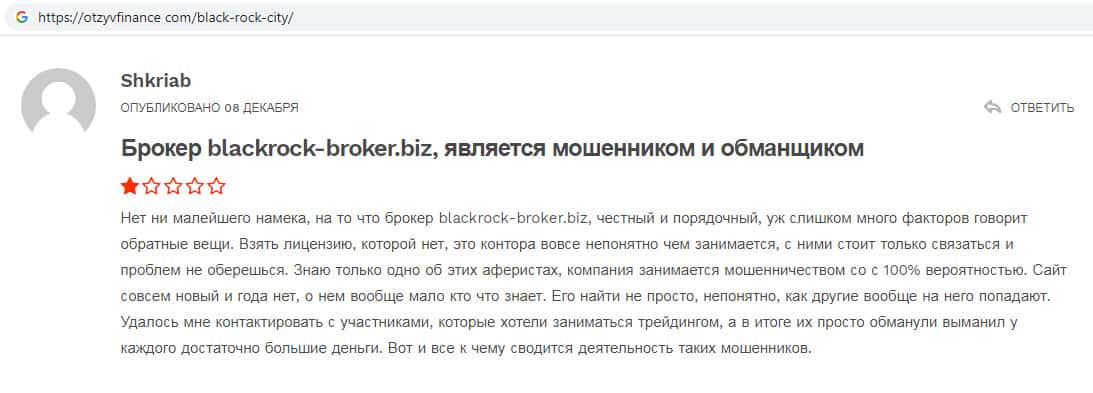 На сайте-отзовике finotzyvy com обнаружен комментарий о скам-организации BlackRock-Broker Biz, представители которой обманывают людей, предоставляя заведомо ложную информацию о торговой площадке, торговых инструментах компании. Автор данного отзыва убедился на собственном опыте в том, что связался с мошенниками.