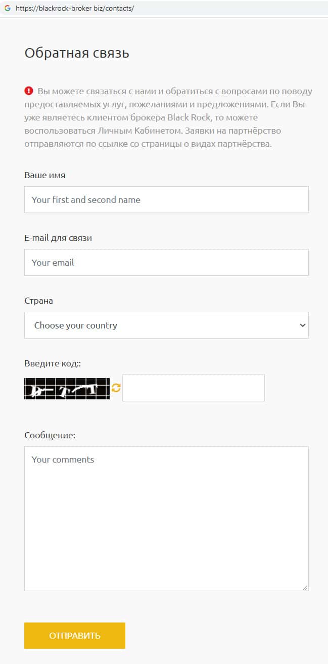 После того, как пользователь заполнил бланк, компания BlackRock-Broker Biz просто так не отвяжется. Не рекомендуем оставлять какие-либо данные о себе на сайте фальшивого брокера даже в виде адреса электронной почты, поскольку жулики могут манипулировать человеком и воздействовать на принятие решения пользователя торговать на данном сайте.