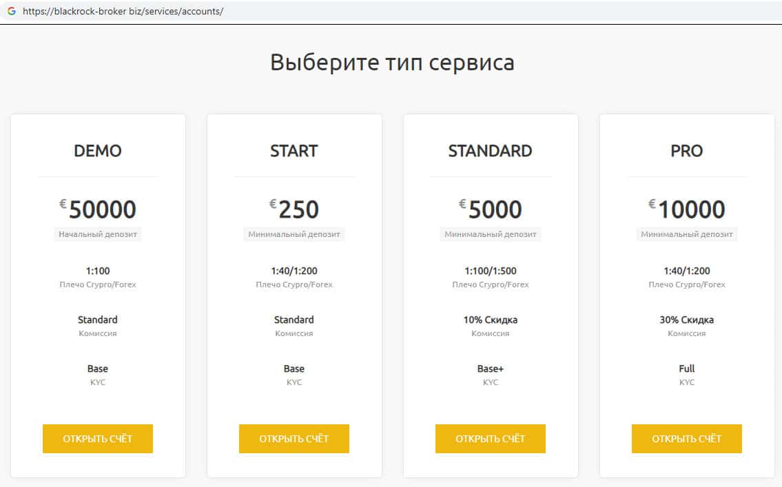 - Типы торговых счетов представленных на сайте скам-брокера Блек Рок Брокер
