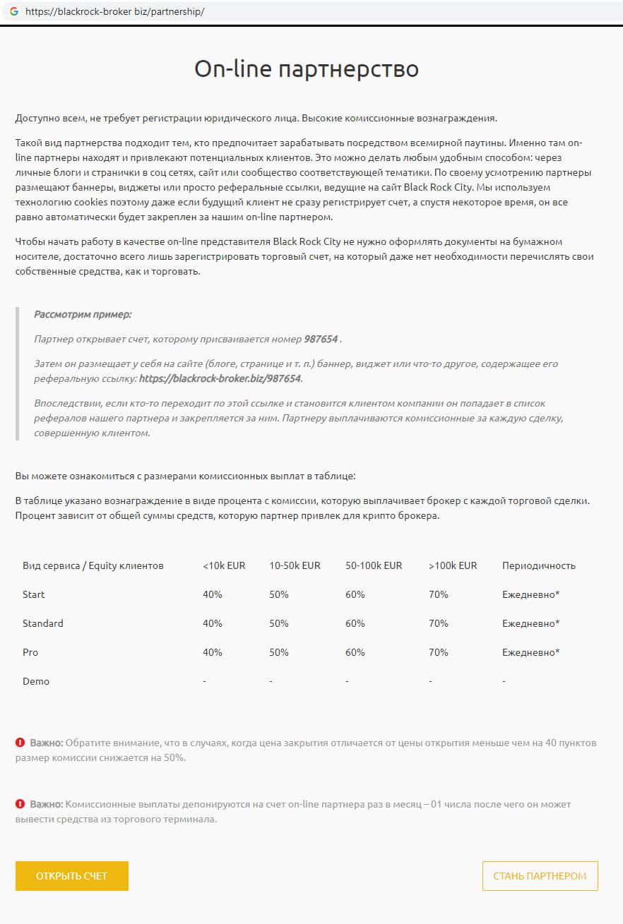 Шулера BlackRock-Broker Biz разработали некую партнерскую программу, которая существует для привлечения как можно большего количества клиентов в их контору. Мошенники Блек Рок Брокер предлагают за счет этого снизить комиссию за торговлю тому, кто пригласил своего друга в данную организацию.