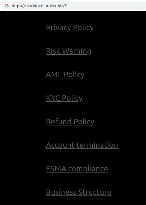 Мошенники Блек Рок Брокер на своем дырявом сайте предлагают ознакомиться с условиями использования сайта, политикой конфиденциальности, партнерским соглашением, информацией о возврате платежей, а так же с информацией о всевозможных рисках. Не один из предоставленных документов не имеет юридической силы.