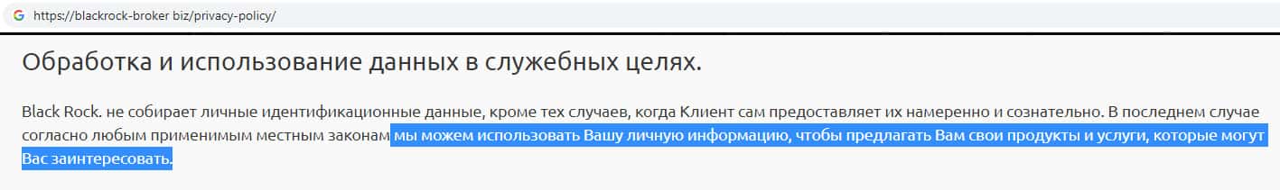 Политика конфиденциальности мошеннической организации Блек Рок Брокер