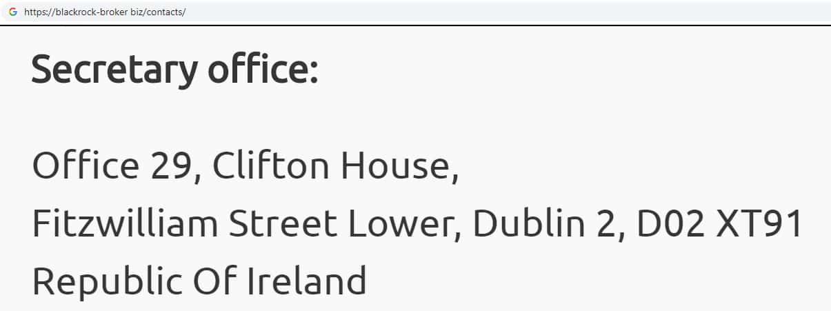 Согласно контактной информации, которую указывает о себе мошенническая организация BlackRock-Broker Biz якобы находится по адресу Офис 29, Клифтон Хаус, Улица Фитцвильям Нижняя, Дублин 2, D02 XT91 Республика Ирландия. Где ныне базируется огромное количество аналогичных компаний.
