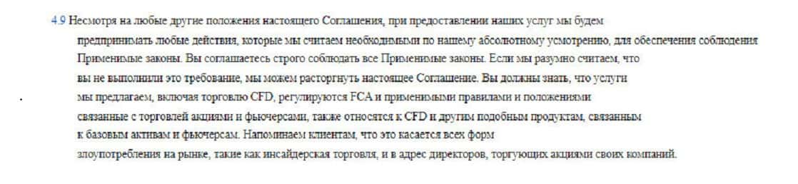 В пунктах 4.10-4.11 контора уведомляет клиента, что не несет ответственности за его убытки, в том числе, полученные из-за технических сбоев и по другим причинам.