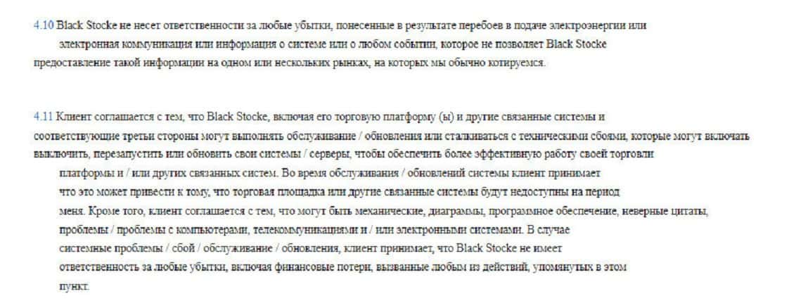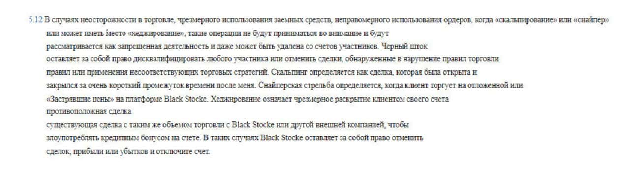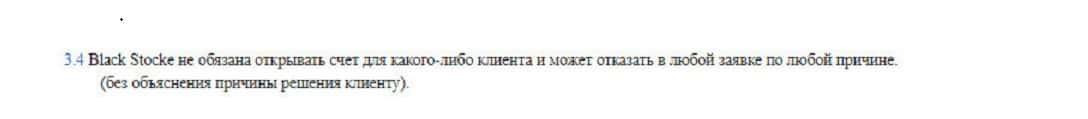 Пункт 3.4 уведомляет пользователей, что компания Блэк Сток вообще не обязана открывать кому-либо счет, а также может отказать в этом без объяснения причин.