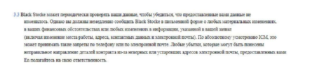 В пункте 3.3 контора BlackStocke говорит о том, что в любое время может начат проверку личных данных пользователя. Под этим предлогом часто блокируются счета клиентов.