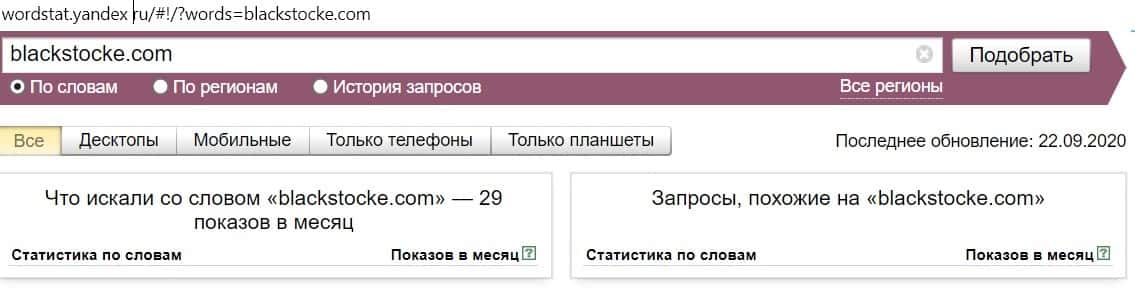 Количество запросов в поисковике Яндекс по доменному имени "blackstocke com" без точки, не отличается от предыдущего. Результат: 29 показов.