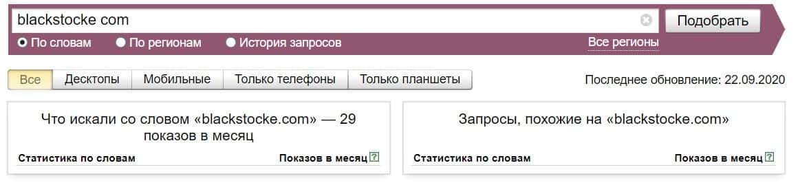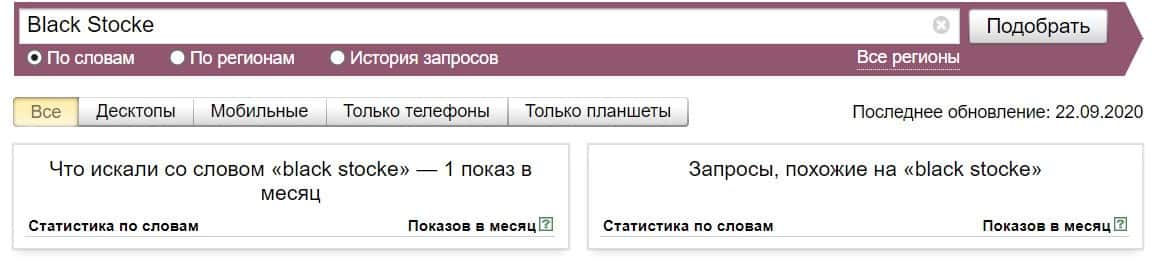 То же название "Black Stocke", но написанное с пробелом, пользователи пытались найти в системе Яндекс всего лишь 1 раз.