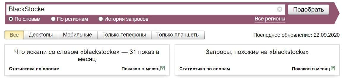 Посмотрим, сколько раз люди искали название бренда "Блэк Сток" на русском языке с пробелом. Незначительное количество запросов.