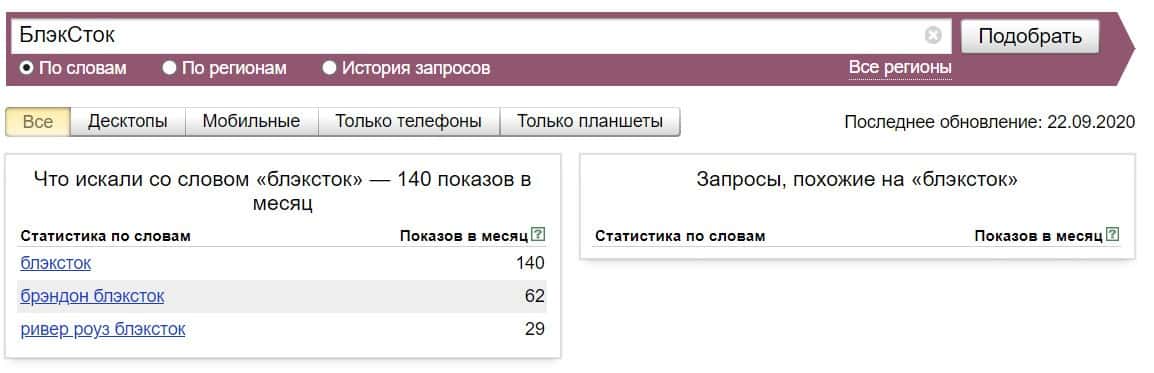 Название бренда на русском языке без пробела "БлэкСток", пользователи пытались найти в системе Яндекс немного чаще: 140 раз.