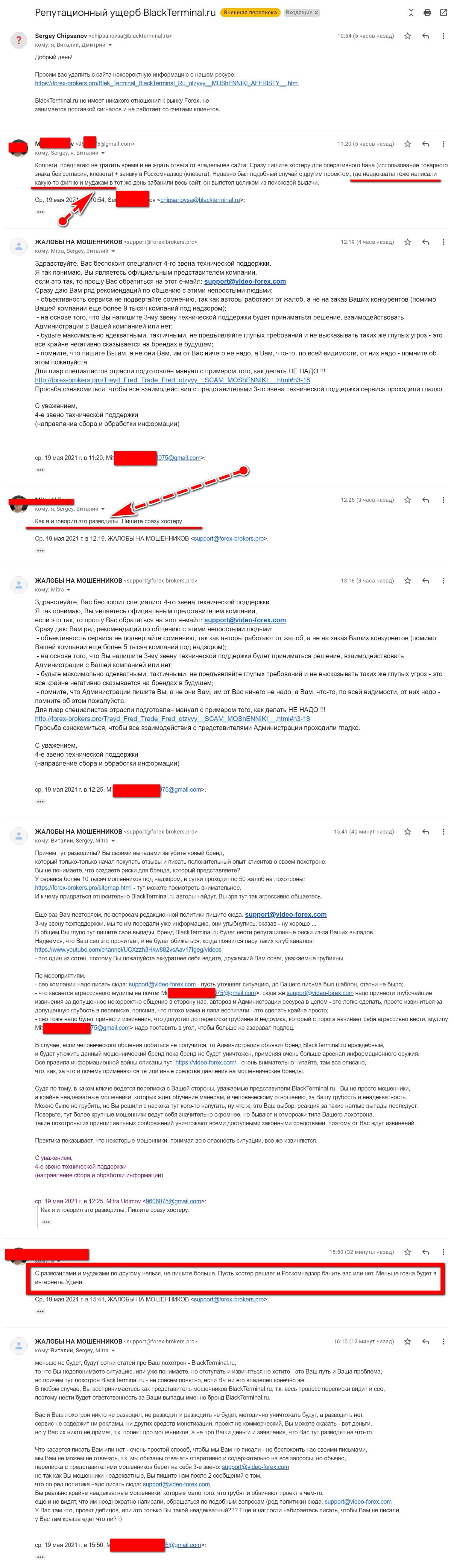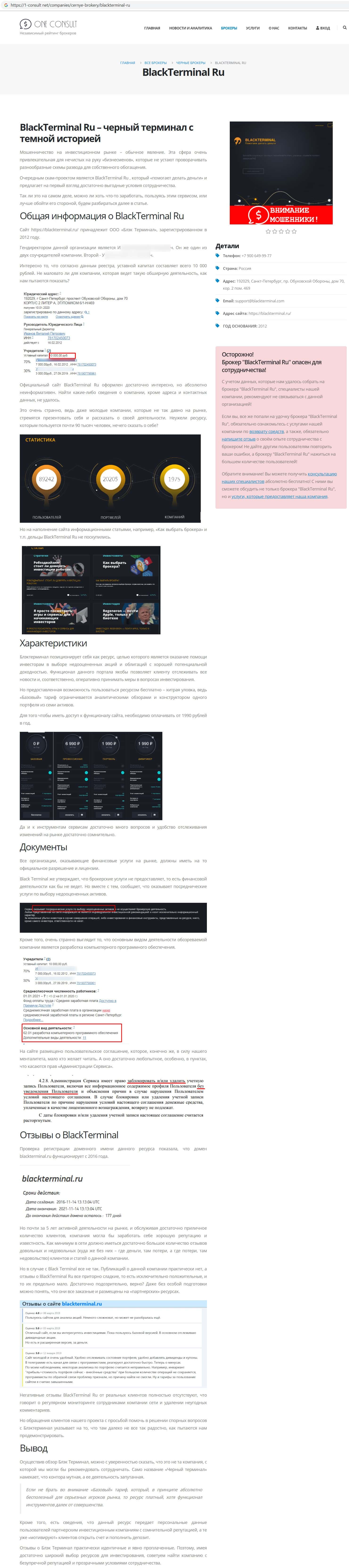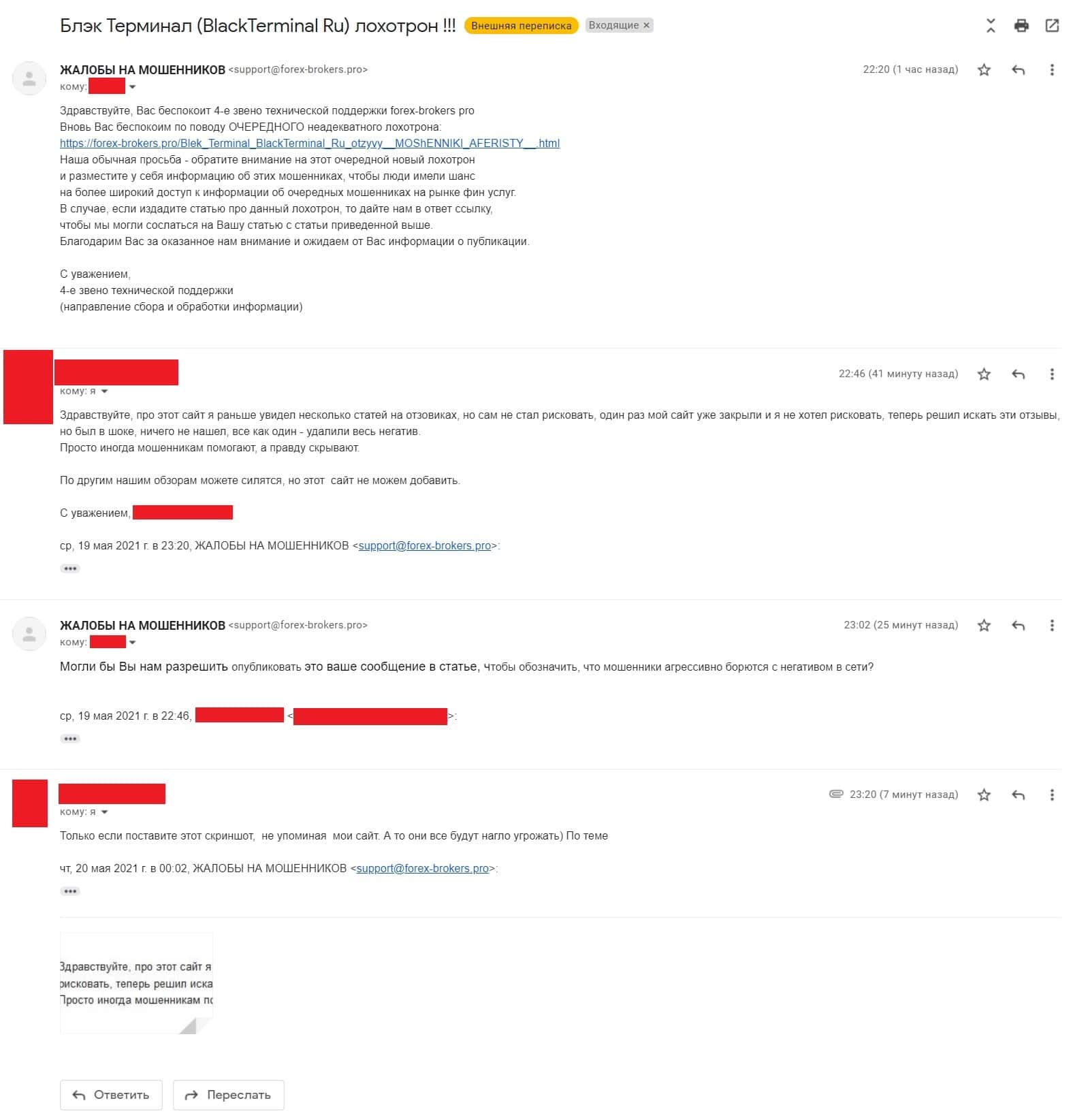 Сервис BlackTerminal Ru, который участвует в мошеннической схеме по передаче пожелавших зарабатывать деньги на фондовых биржах людей в разные лохотроны, не просто занимается чисткой правдивой информации про их аферу, но еще и угрожает расправой веб-ресурсам отзовикам, далее опубликовано письмо администратора одного из таких сайтов, который пожелал скрыть название сайта и контакт, т.к. деятели BlackTerminal Ru ранее запугивали его.