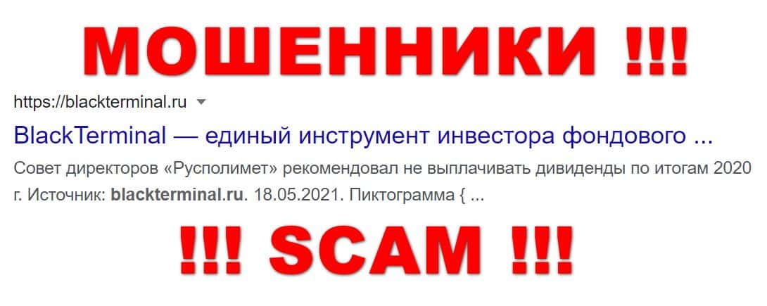 Блэк Терминал - очередная площадка по поиску потенциальных лохов, которая якобы помогает инвесторам, но в действительности заманивает наивную клиентуру. Схема работает примерно как у Инвестинг Ком, лох регистрируется на площадке, и затем данные лоха передаются в лохотрон, в данном случае в МаксиМаркетс (MaxiMarkets), и как у BestStocks, а в случае с "Черным Терминалом" ожидаем подобную ситуацию. А рецепт для Вас тут один - НИКАКИХ СВОИХ ДАННЫХ И ТЕМ БОЛЕЕ ДЕНЕГ МОШЕННИКАМ Блек Терминал НЕ ДАВАЙТЕ !!!