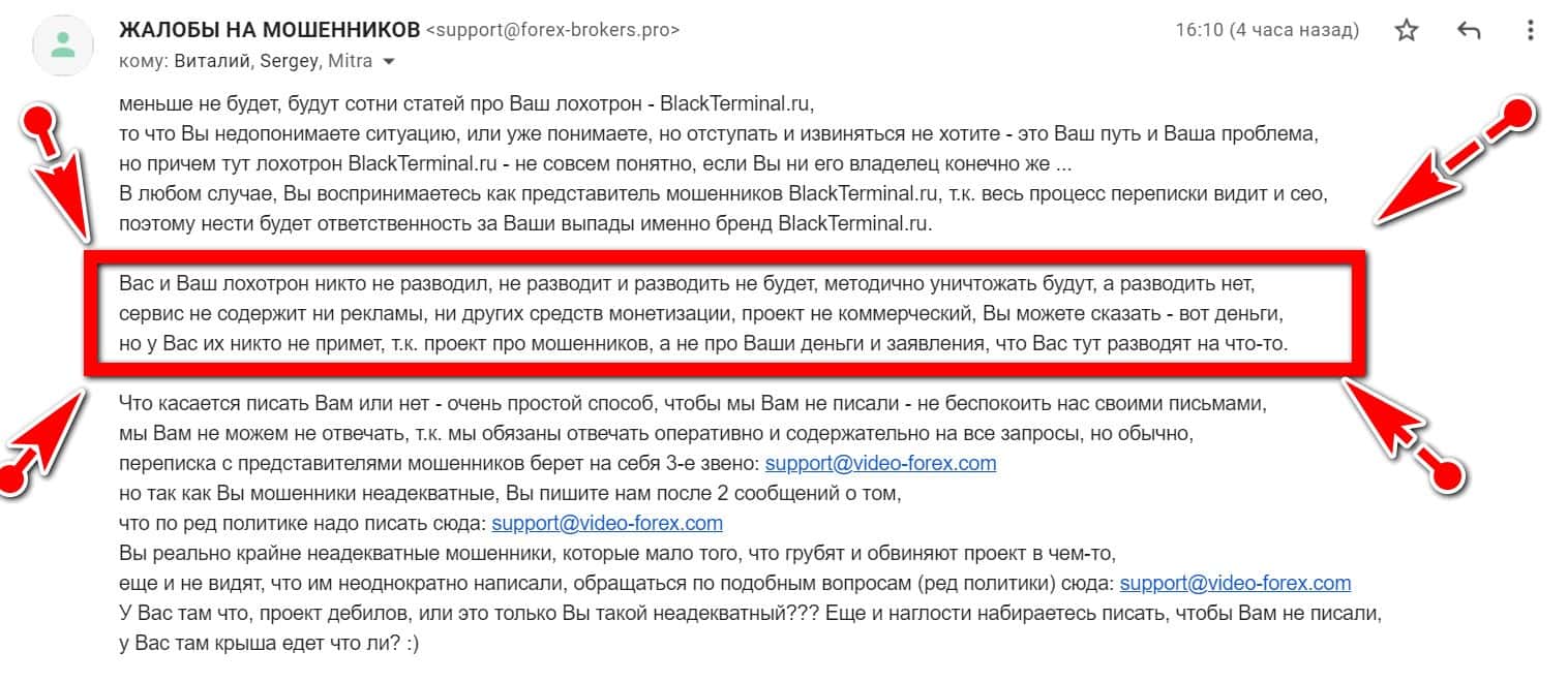 Заметим, что мошенники BlackTerminal Ru указывают, что сервис forex-brokers.pro занимается вымогательством, только мошенники забывают, что выше им написали уже, что сервис является некоммерческим ресурсом, и даже если они скажут нате деньги - эти деньги у мошенников BlackTerminal Ru сервис не примет.