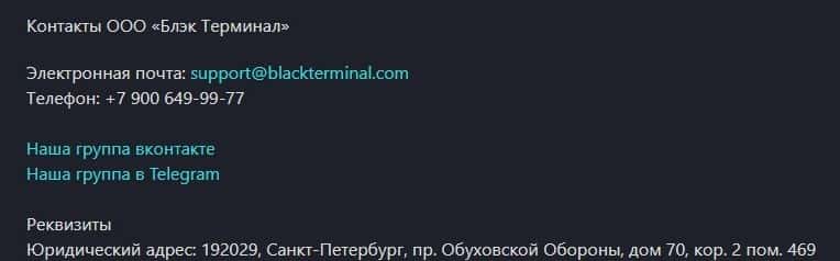 Исходя из официальных данных, мошенническая контора BlackTerminal Ru принадлежит некой компании под названием ООО «Блэк Терминал», которая зарегистрирована в России.