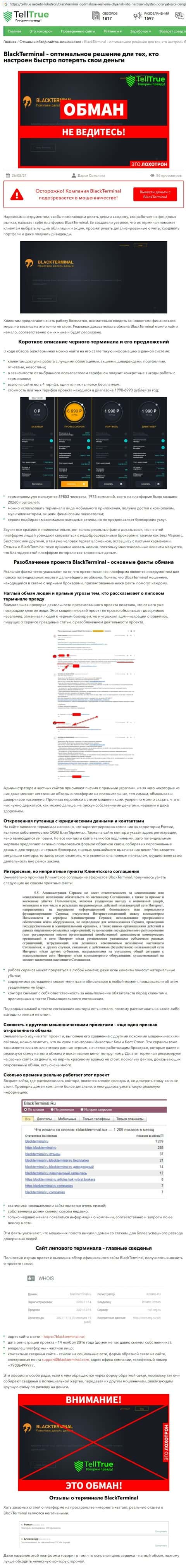 Далее представлен информационный материал о мошенническом веб-сервисе BlackTerminal Ru, созданный интернет-ресурсом forex-kitchen info.
