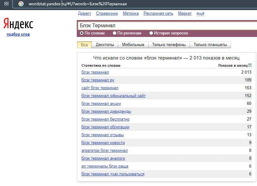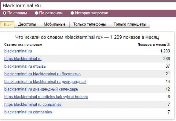 Ну и конечно же бренд "BlackTerminal.Ru" по версии Яндекс.Вордстат набрал 1209 показов, что показывает их очень высокую популярность в интернете.