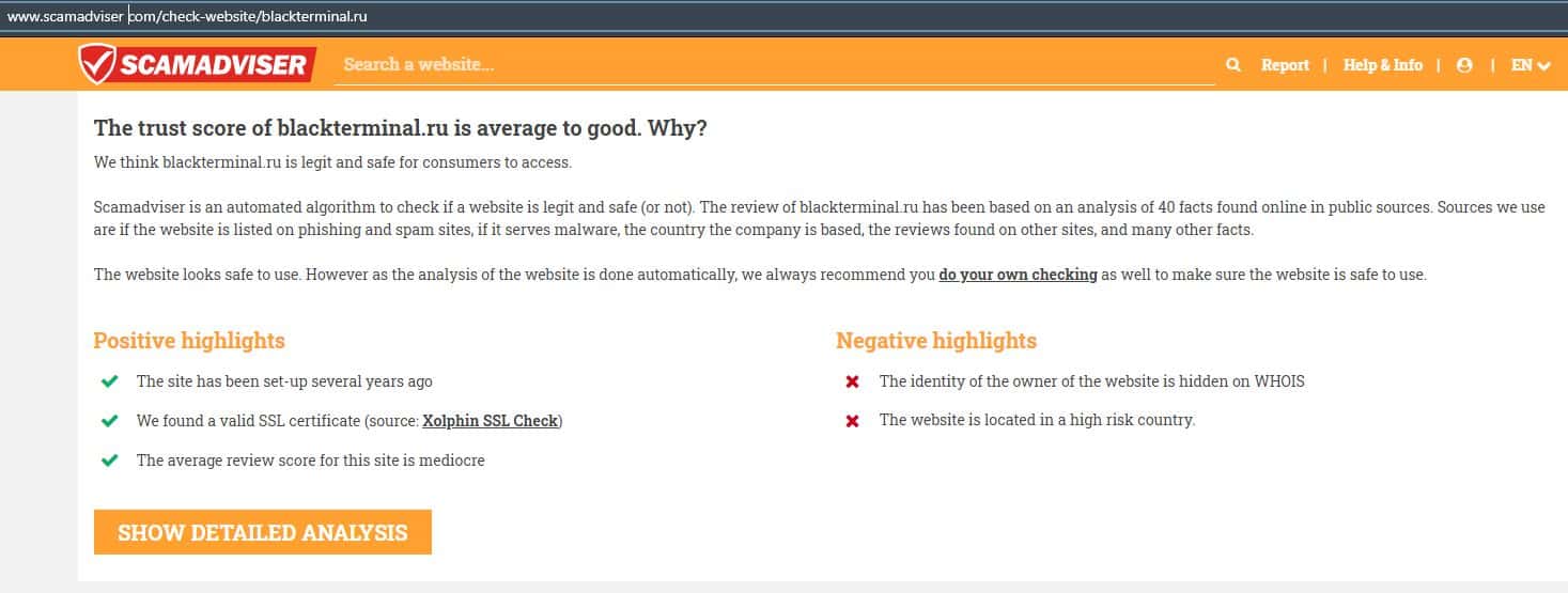 Что говорит сервис скамадвайзер ком о сайте BlackTerminal Ru?